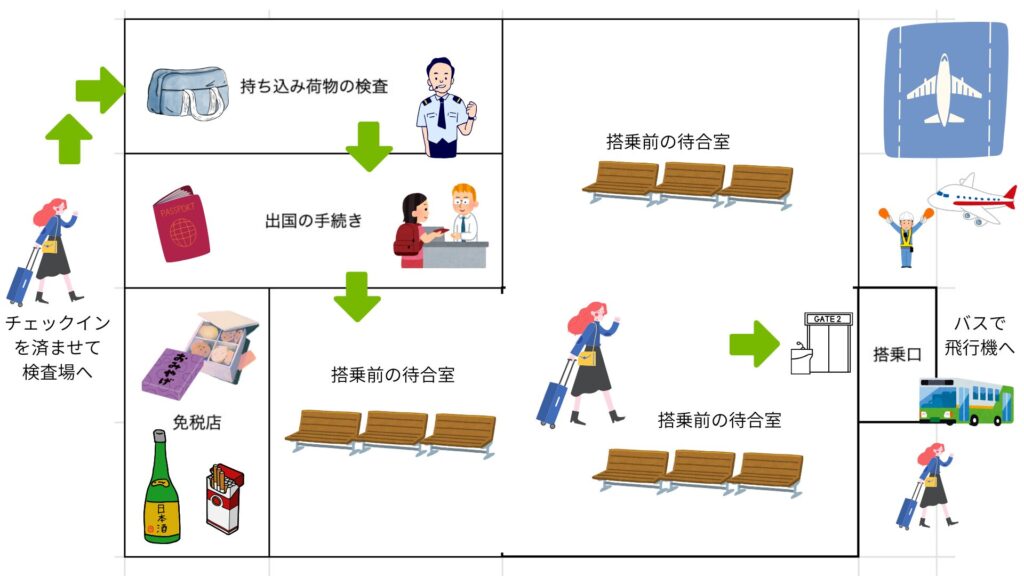【↑画像】チェックインから搭乗口までの流れを私の記憶で図にしてみました。