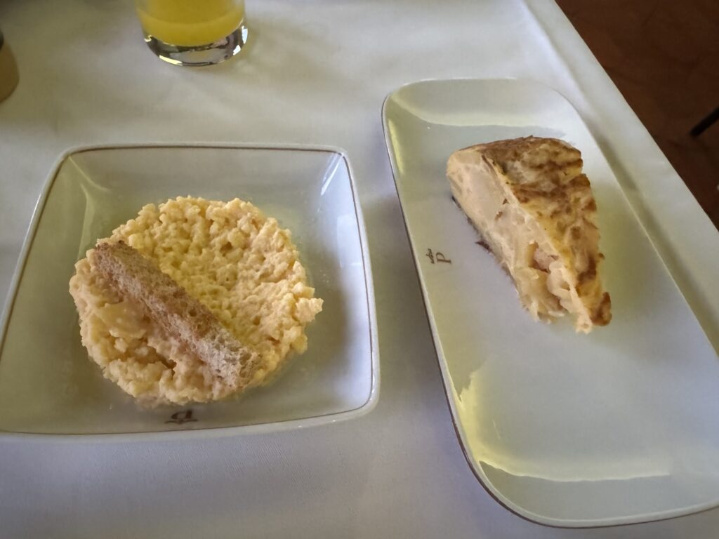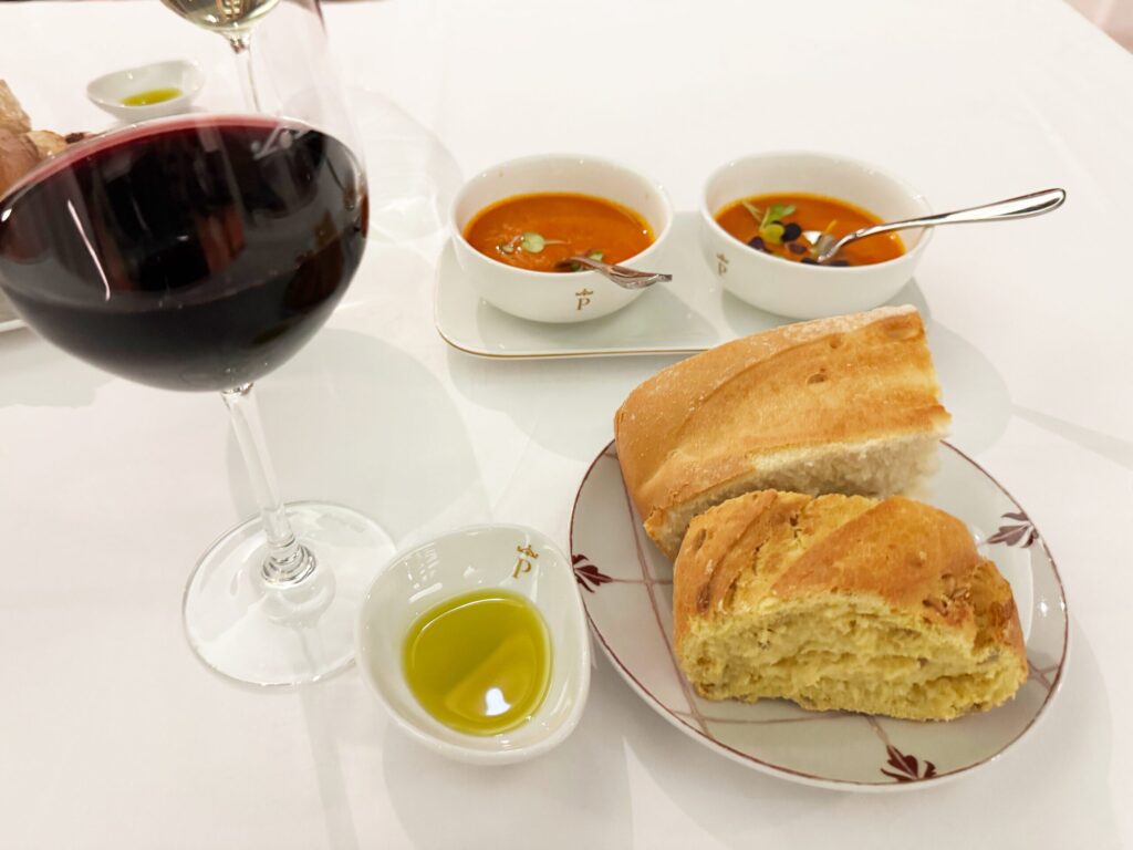 【↑画像】左:奥のオレンジ色のボールは、サルモレホです。注文をしていませんが食事前の突き出しとして提供されたようです。メイン料理が運ばれた時に残ったサルモレホを下げられちゃいました。美味しかったので食べ切りたかった…