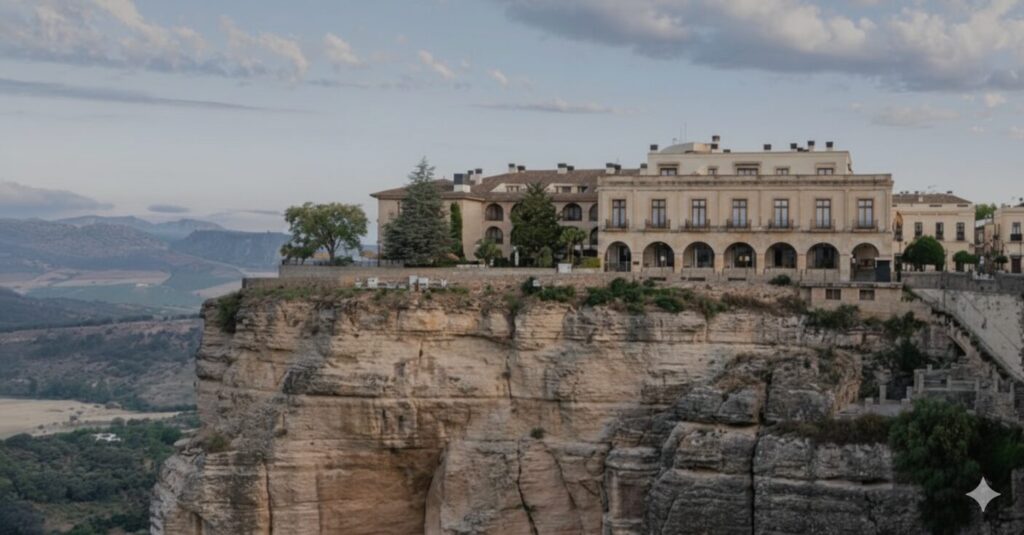 このパラドールは、アンダルシア地方の白い村ロンダを象徴する、深さ約100メートルを誇るエル・タホ渓谷の断崖絶壁に建っています。かつてはロンダ旧市庁舎として使われていた建物で、目の前には有名なヌエボ橋が架かっています。
