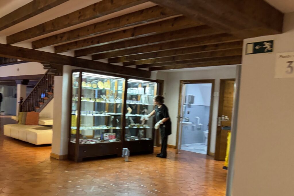 【↑画像】左:4段の階段にも昇降機が付いています。右:ガラスケースの中も清掃。お土産物ケース内のホコリも除去されて、随所に好印象ポイントが。
