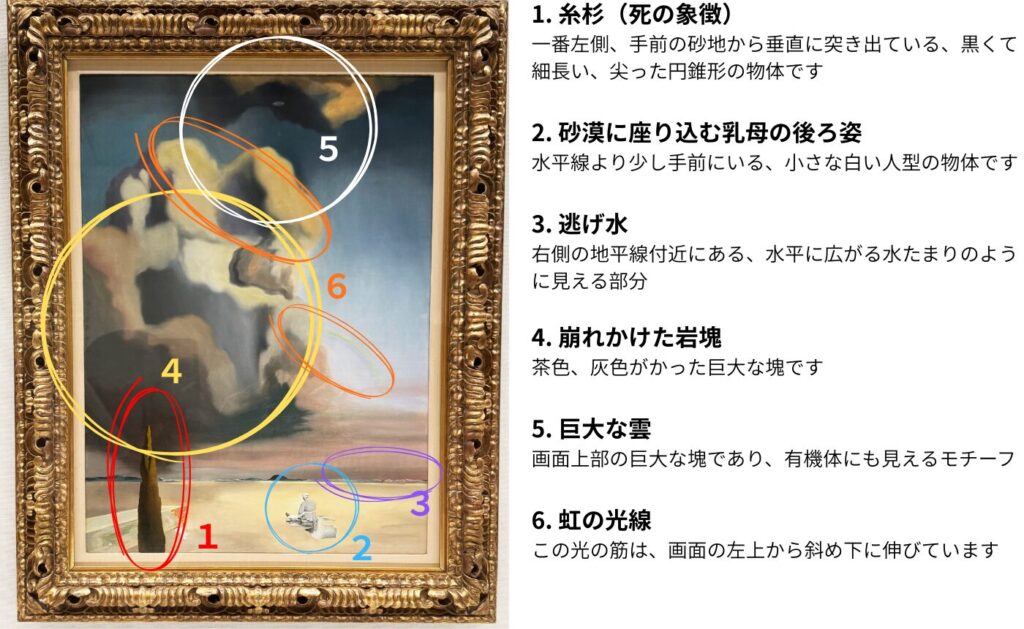 解説: 砂漠の蜃気楼(しんきろう)の一種です。ダリは、現実ではないのにリアルに見える現象を取り入れることで、「幻影」という作品テーマを強調しています。