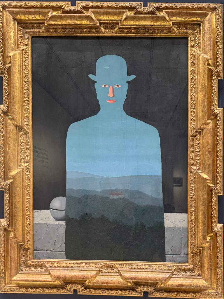 通常、マグリットの描く「山高帽の男」は後ろ姿であったり、顔が隠されていたりすることが多いのですが、この作品ではシルエットの中に直接「目」と「鼻」が描かれています。