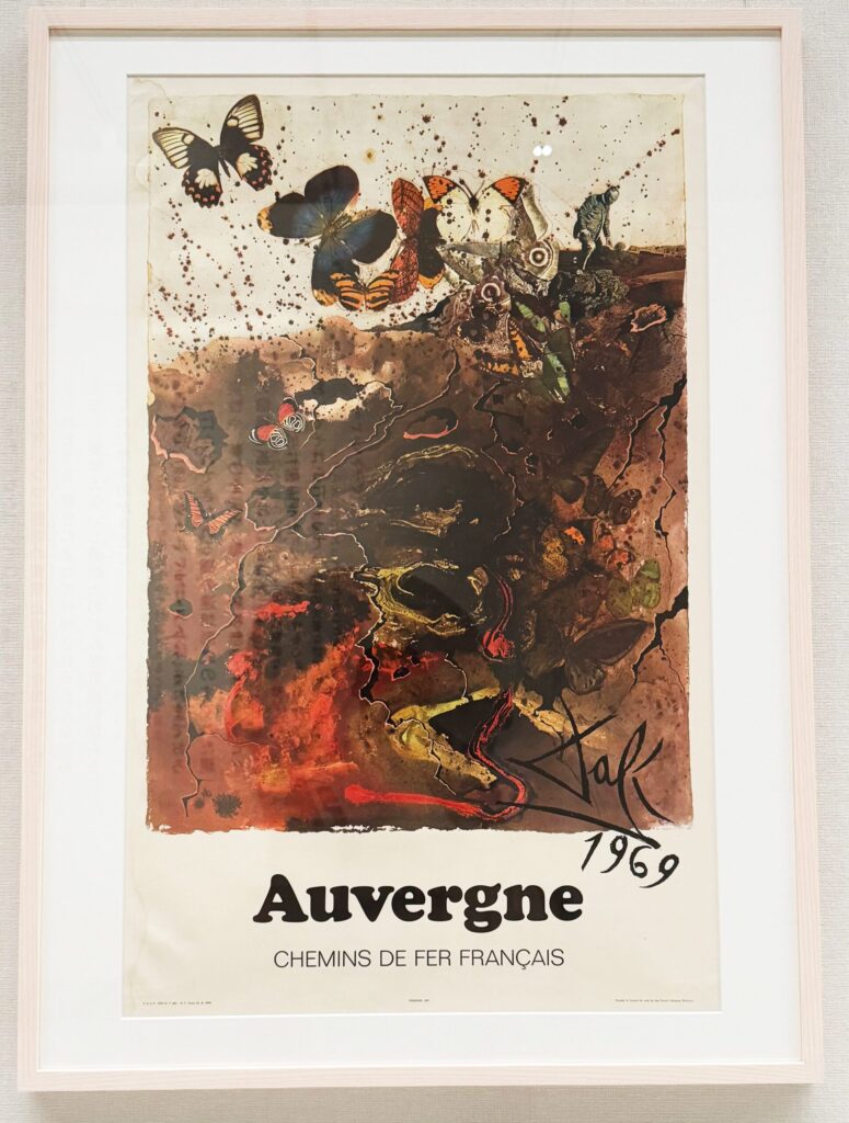 【↑画像】オーベルニュの火山や溶岩(濃い茶色、赤、黒)が抽象化され、蝶を書き足す奇妙なイメージがダリらしいですね。